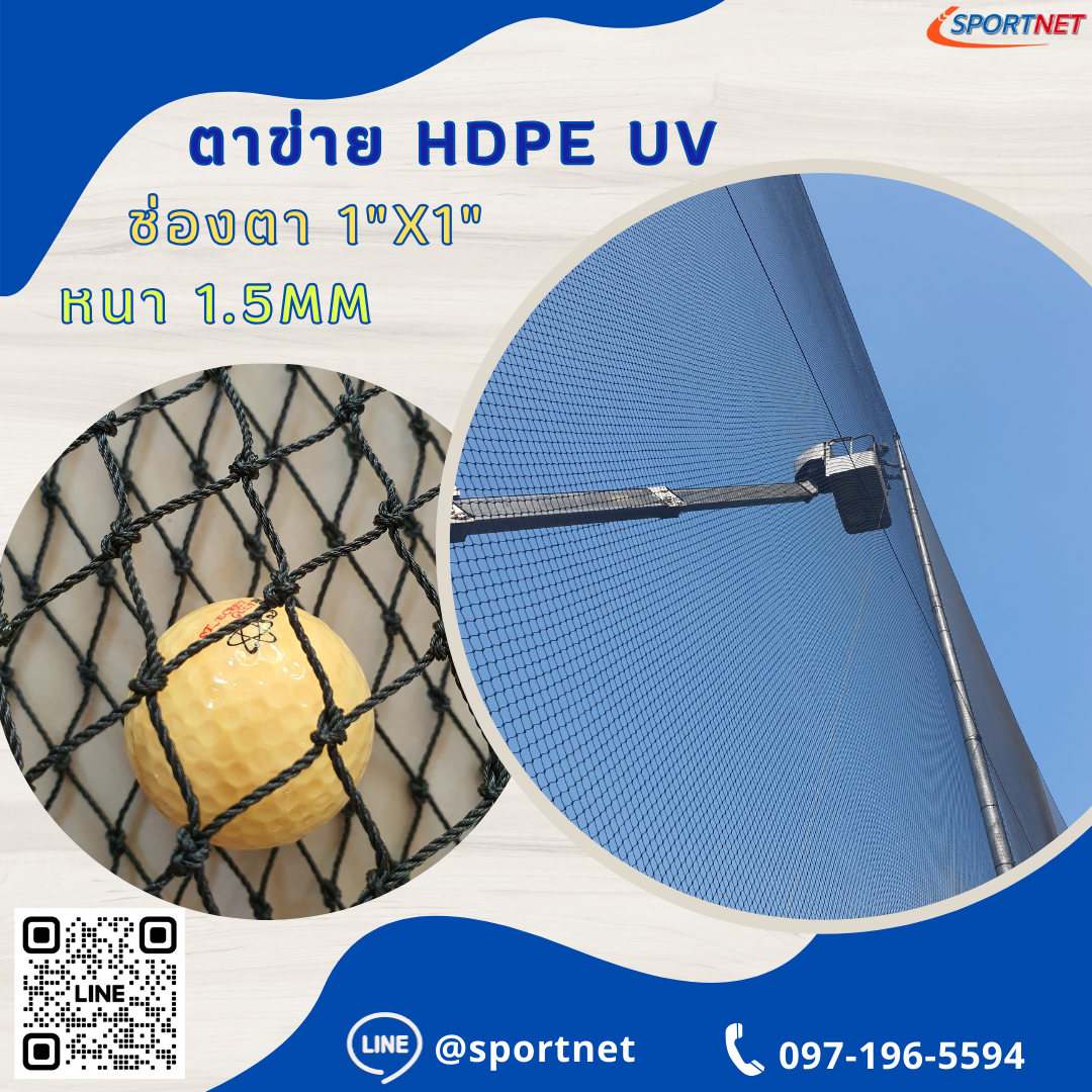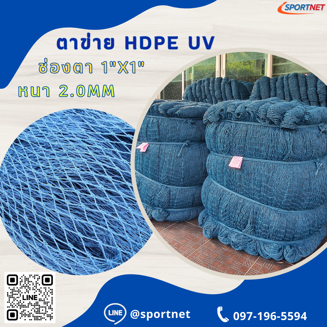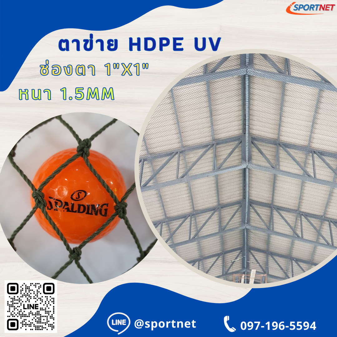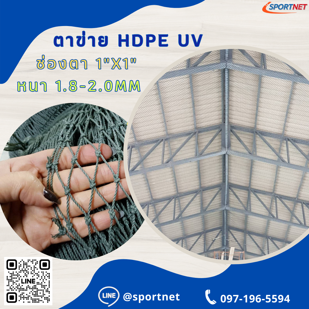 ตาข่าย HDPE (High Density Polyethylene) UV Protection ผสมสารป้องการยูวี สำหรับใช้งานกลางแจ้งโดยเฉพาะ อายุการใช้งานกลางแดดกลางฝนนาน มีความหนาแน่นสูง ชนิดเส้นใยเหนียวพิเศษ เกลียวอัดแน่น ทนทานต่อแรงกระแทก รองรับแรงดึงสูง มีความยืดหยุ่นได้ดี  ไม่อมน้ำและทนต่อความเป็นกรด ส่งตรงจากโรงงาน สามารถสั่งทอผืนใหญ่เพื่อคลุมสินค้า หรือคลุมพาเลท สั่งผลิตตามขนาดเพื่อเป็นตาข่ายกั้นสนามกีฬาทุกชนิด หรือ ตาข่ายกันนก ทั้งในโรงงานและโกดัง