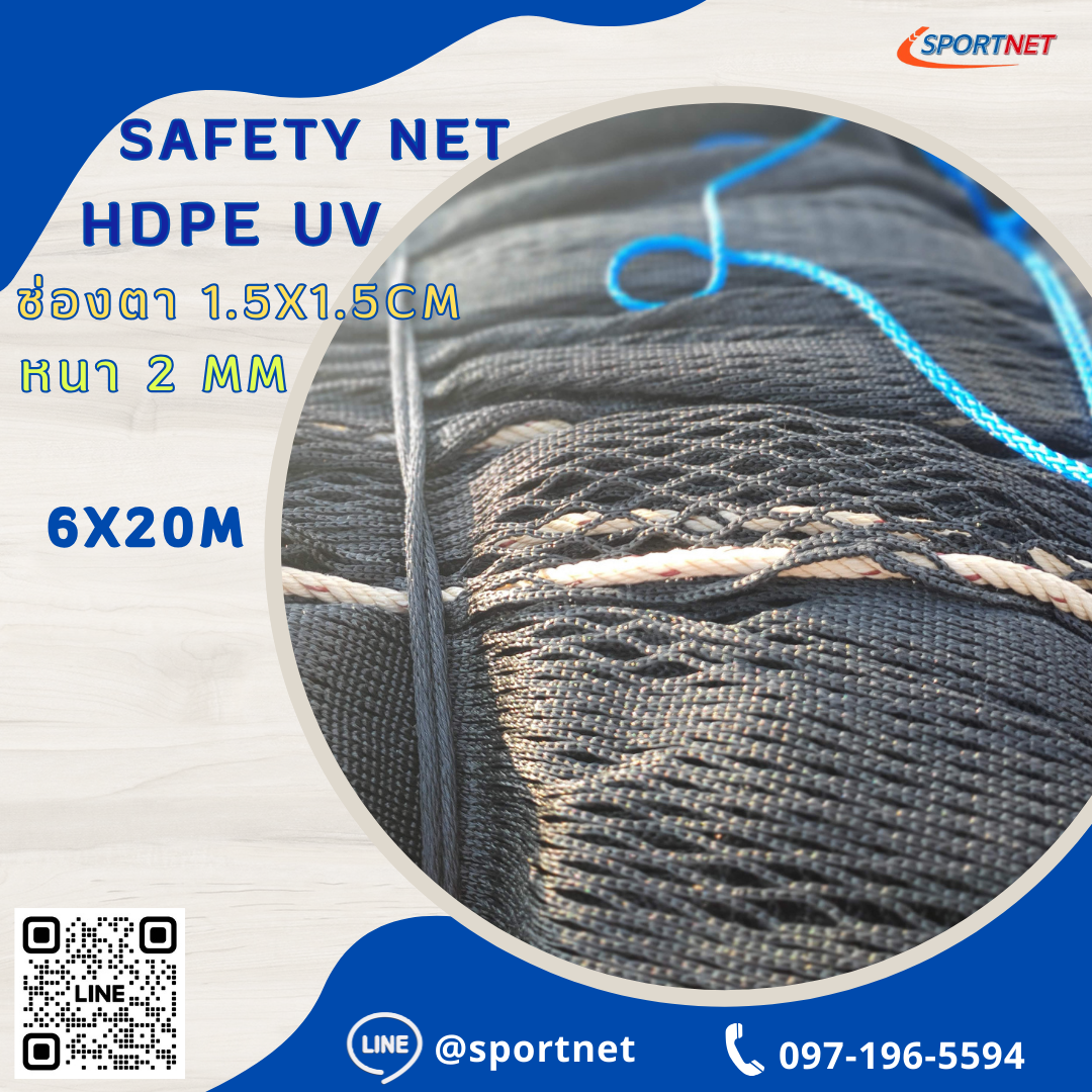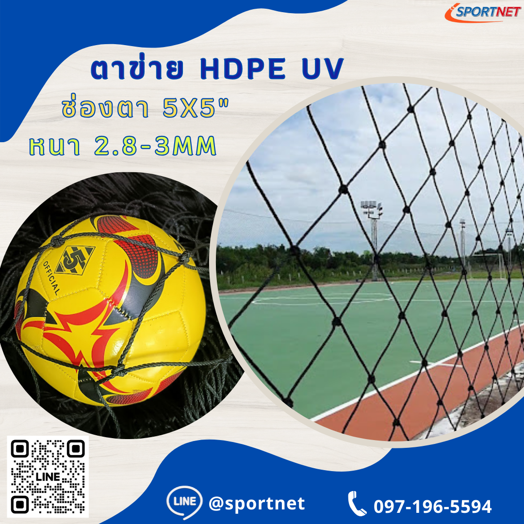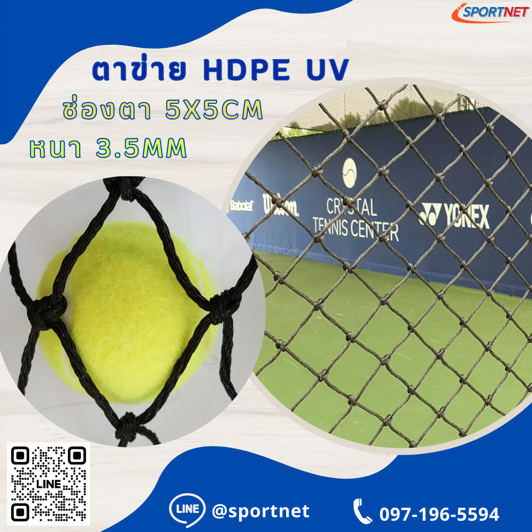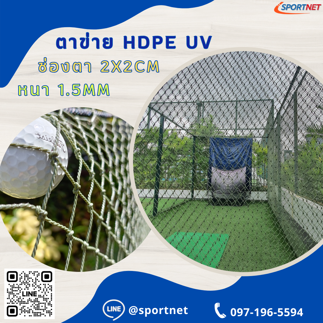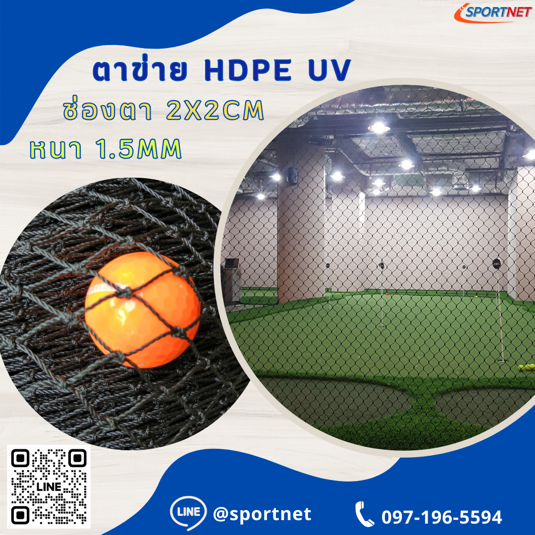 ตาข่าย HDPE (High Density Polyethylene) UV Protection ผสมสารป้องการยูวี สำหรับใช้งานกลางแจ้งโดยเฉพาะ อายุการใช้งานกลางแดดกลางฝนนาน มีความหนาแน่นสูง ชนิดเส้นใยเหนียวพิเศษ เกลียวอัดแน่น ทนทานต่อแรงกระแทก รองรับแรงดึงสูง มีความยืดหยุ่นได้ดี  ไม่อมน้ำและทนต่อความเป็นกรด ส่งตรงจากโรงงาน สามารถสั่งทอผืนใหญ่เพื่อคลุมสินค้า หรือคลุมพาเลท สั่งผลิตตามขนาดเพื่อเป็นตาข่ายกั้นสนามกีฬาทุกชนิด หรือ ตาข่ายกันนก ทั้งในโรงงานและโกดัง